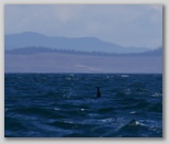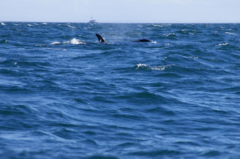 Eventually after a frantic chase out into the open water guided by frequent radio contact from other boats in the area Beamer dropped the throttle and told us that the resident orca pod was heading for us. Then we saw our first dorsal fin popping up, then the tail fin disappearing with a splash. Several whales came up for us, as the pod slid past. The rough conditions made pictures very difficult, so I spent the time just watching.